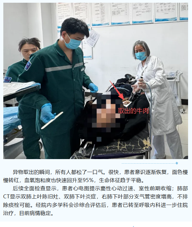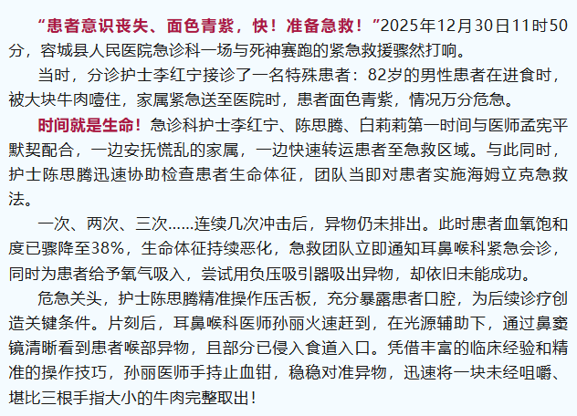 容城县紧密型医共体——紧急救援!82岁老人大块牛肉卡喉窒息,容城县人民医院多科协作化险为夷!